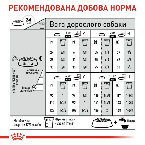 | Вага | Помірна активність(г) | Сухий корм + павук | Підвищена активність (г) | Сухий корм + павук |