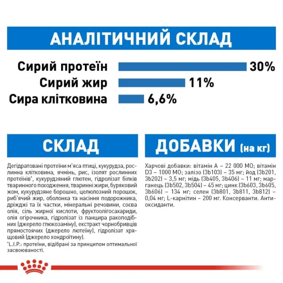 Високий вміст білків* (30%) допомагає підтримувати м'язову масу, а низький вміст жирів* (11%) обмежує набір надмірної ваги. Оптимальне поєднання розчинної та нерозчинної клітковини створює відчуття ситості, а омега-3 жирні кислоти підтримують здоров'я суглобів. Цей повнораціонний корм високої смакової привабливості сприяє підтримці оптимальної ваги.