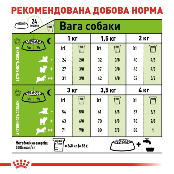 | Вага собаки | Помірна активність | Підвищена активність |