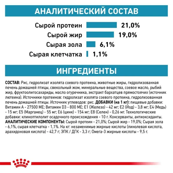 Рис, гідролізат ізоляту соєвого протеїну, тваринні жири, гідролізовані печінка свійської птиці, буряковий жом, мінеральні речовини, соєва олія, риб'ячий жир, фруктоолігосахариди, олія огірковика, екстракт чорнобривців прямостоячих (джерело лютеїну). Джерела протеїнів: гідролізат ізоляту соєвого протеїну, гідролізовані печінка свійської птиці. Джерело вуглеводів: рис.