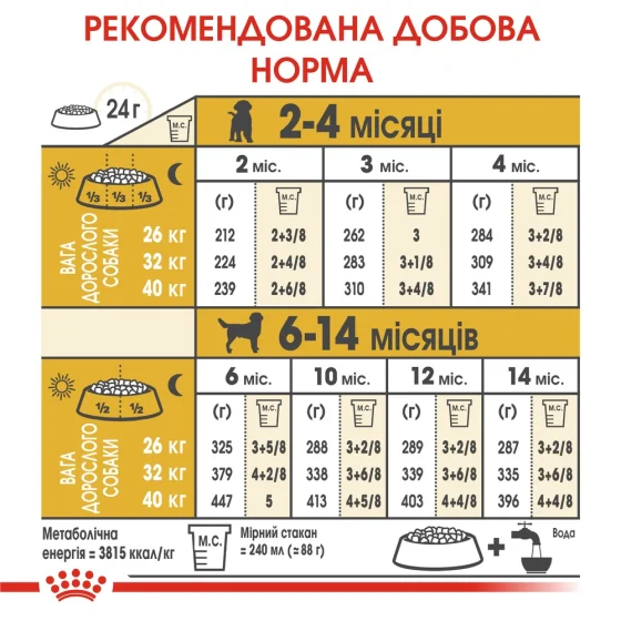| Вік | Вага дорослого собаки 26 кг | Вага дорослого собаки 33 кг | Вага дорослого собаки 40 кг |