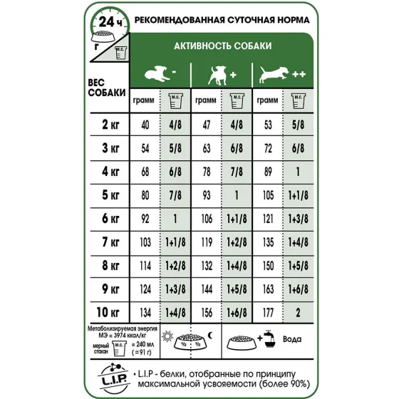 Сприяє підтримці ідеальної ваги в собак малих розмірів завдяки адаптованій енергоємності раціону та стимуляції метаболізму жирів за допомогою L-карнітину.