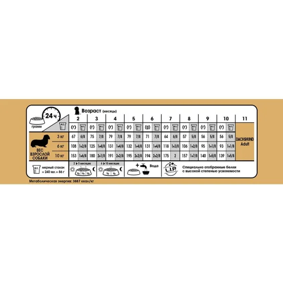 | Возраст | Вага дорослого собаки 3 кг | Вага дорослого собаки 6 кг | Вага дорослого собаки 10 кг |