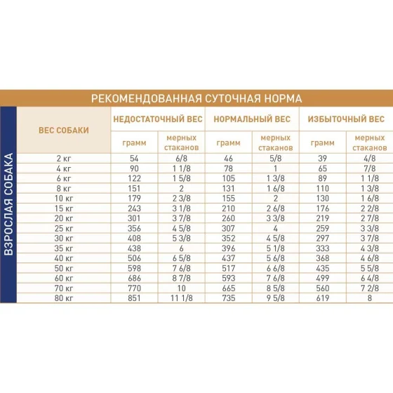 | Вага (кг) | Недостатня вага (г) | Недостатня вага (м.с) | Нормальна вага (г) | Нормальна вага (м.с) | Зайва вага (г) | Зайва вага (м.с) |