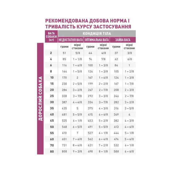 | Вага (кг) | Недостатня вага (г) | Недостатня вага (м.с) | Нормальна вага (г) | Нормальна вага (м.с) | Зайва вага (г) | Зайва вага (м.с) |