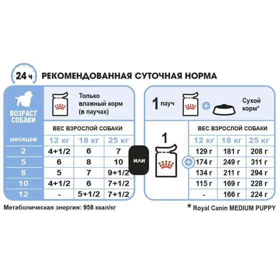 .| Вік | Вага дорослого собаки 12 кг | Вологий корм + сухий корм | Вага дорослого собаки 18 кг | Вологий корм+сухий корм | Вага дорослого собаки 25 кг | Вологий корм+сухий корм |