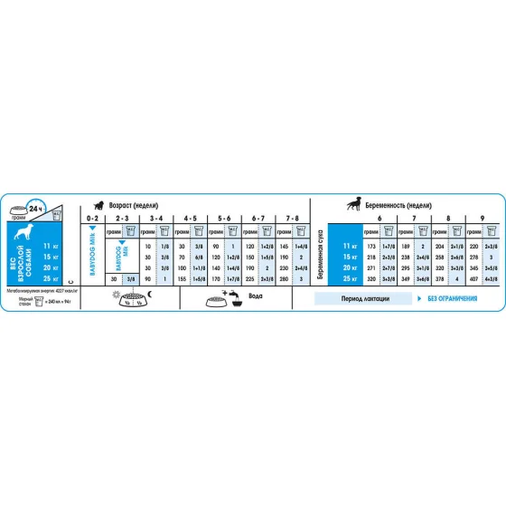 | 15 кг | Babydog Milk | Babydog Milk | 30 г (3/8) | 70 г (6/8) | 120 г (1+2/8) | 150 г (1+ 5/8) | 190 г (2) |