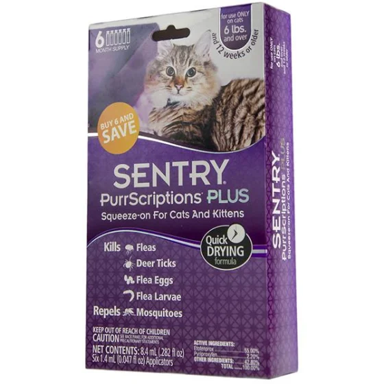 Також до складу Sentry PurrScriptions для кішок входить регулятор зростання комах – пірипроксифен, який вбиває яйця та личинки бліх.