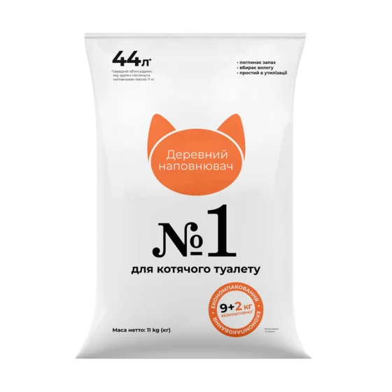 Деревний наповнювач №1 для котячого туалету, 9 + 2 кг (44 л)