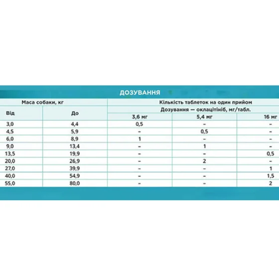 Следует убедиться в том, что собака полностью проглотила необходимую дозу препарата. Прием корма на биодоступность оклацитиниба не влияет.